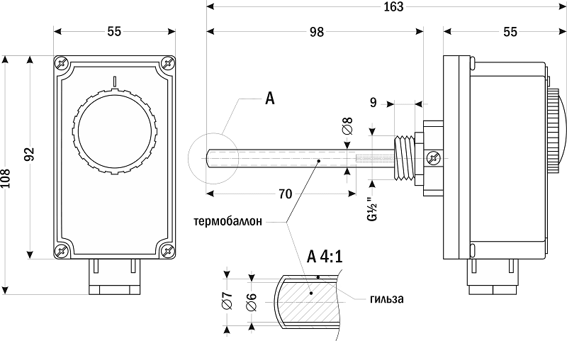 Штуцер со стандартной дюймовой резьбой G½" позволяет легко монтировать термостат в стандартное резьбовое отверстие в объекте измерения температуры, а также использовать стандартные и широко распространенные футорки (например, VTR.581.N) для перехода на остальные размеры резьбы