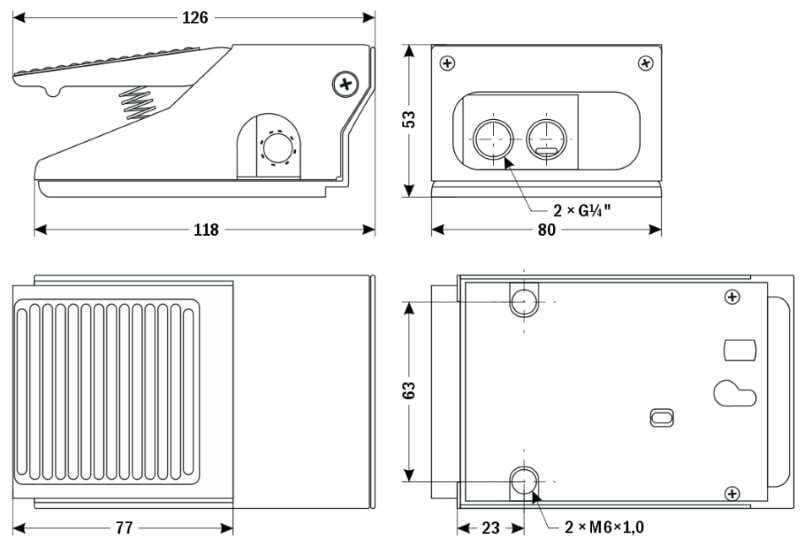 Описание прибора:Для управления пневмоцилиндрами одностороннего действия используется пневмопедаль ПП322, имеющая возможность коммутировать линии питания, потребите-ля и выхлопа. Такая пневмопедаль обозначается как 3/2 (3-линейная, 2-позиционная). Это означает, что она имеет 3 канала ввода-вывода: вход (от источника воздуха), выход (для подключения рабочего органа) и выхлоп (для выброса воздуха при обратном ходе рабочего органа) и 2 возможных положения золотника. Спускной порт оборудован глушителем.
