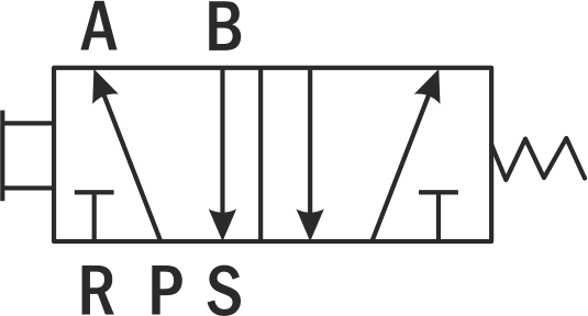 В исходном положении воздух подается через порт питания P на рабочий порт А, при этом рабочий порт В соединен с портом выхлопа S. При нажатии на кнопку порт питания Р переключается на рабочий порт В, а рабочий порт А соединяется с портом выхлопа R. При снятии нажима золотник под действием пружины возвращается в исходное положение.