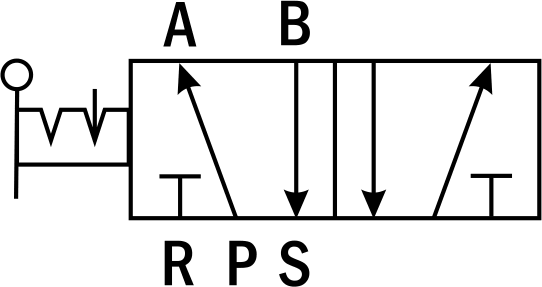 В исходном положении воздух подается через порт питания P на рабочий порт А, при этом рабочий порт В соединен с портом выхлопа S. При нажатии на рукоятку порт питания Р переключается на рабочий порт В, а рабочий порт А соединяется с портом выхлопа R.