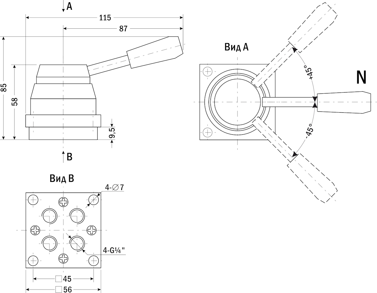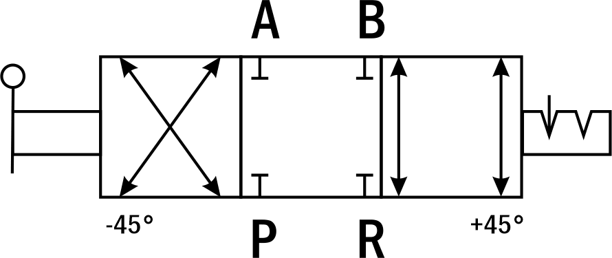 В нейтральном положении N все порты перекрыты (см. чертеж). При переводе рукоятки в положение +45° порт питания Р соединяется с рабочим портом А, а рабочий порт В соединяется с портом выхлопа R. При переводе рукоятки в положение -45° порт питания Р переключается на рабочий порт В, а рабочий порт А соединяется с портом выхлопа R.