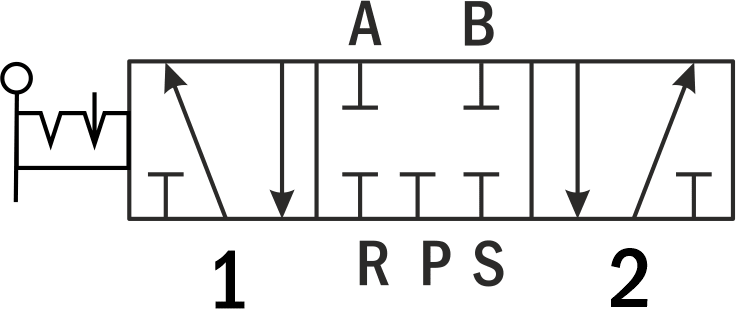 В нейтральном положении все порты закрыты. При переводе рукоятки в положение 1 воздух подается через порт питания P на рабочий порт А, при этом рабочий порт В соединен с портом выхлопа S. При переводе рукоятки в положение 2 порт питания Р переключается на рабочий порт В, а рабочий порт А соединяется с портом выхлопа R.