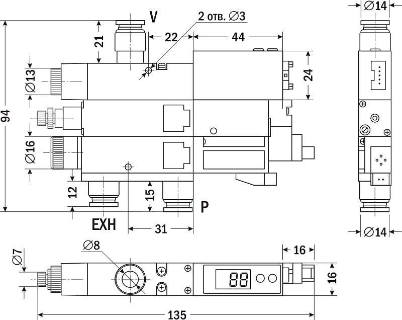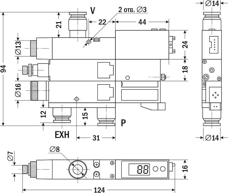 Воздушный фильтр (2) служит для фильтрации воздуха, поступающего через порт вакуума, для защиты вакуумного эжектора от попадания пыли.