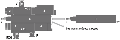 Сжатый воздух от компрессора подается на входной порт (8) и через управляющий соленоидный клапан (4) попадает в эжектор (1). В корпусе эжектора поток воздуха проходит по техническому каналу через сопло Лаваля и создает всасывающий эффект на порте вакуума (9). Далее он вместе с потоком всасываемого воздуха выводится из системы через порт выхлопа (10).