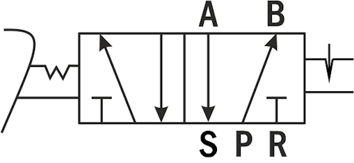 В исходном положении воздух подается через порт питания Р на рабочий порт B, при этом рабочий порт A соединен с портом выхлопа S. При нажатии на педаль порт питания Р переключается на рабочий порт A, а рабочий порт B переключается на порт выхлопа R.